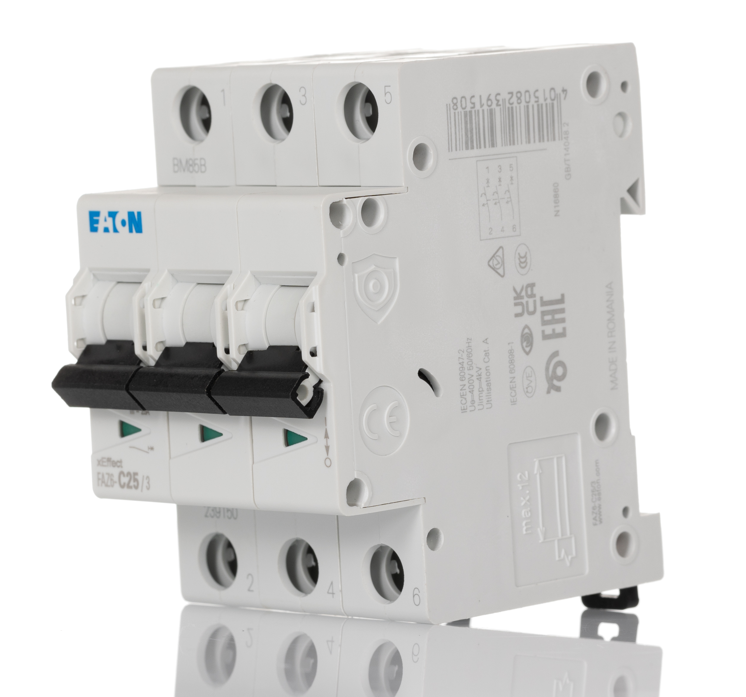 5. Wyłącznik nadprądowy MCB, Typ C, 3-biegunowy, 25A, 230 → 400V, 60V, na szynę DIN, Eaton FAZ6 546.07