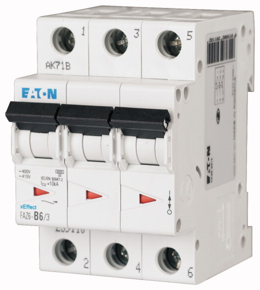 11. Wyłącznik nadprądowy MCB, Typ B, 3-biegunowy, 1A, na szynę DIN, Eaton FAZ6-B1/3 559.87