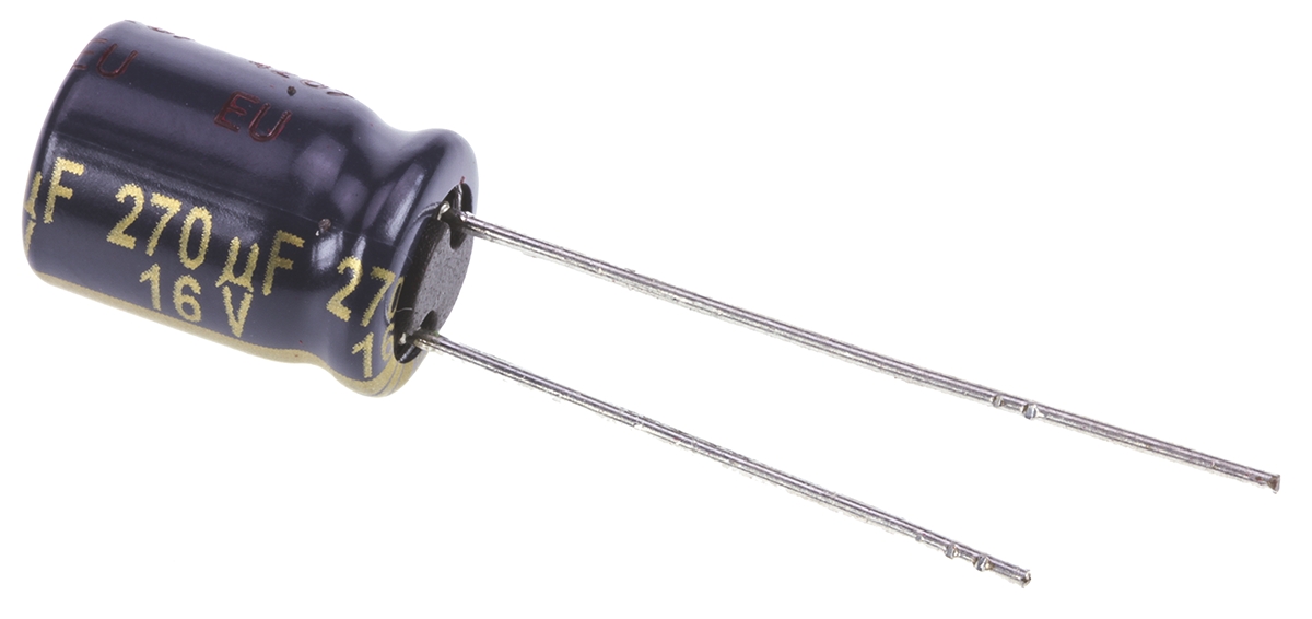 5. Kondensator 270μF 16V dc Radialny, Otwór przelotowy Panasonic roztaw: 3.5mm 8 (Dia.) x 11.5mm 0.92 x200