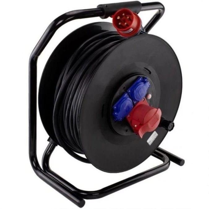 Przedłużacz siłowy zwijany na bębnie Rozgałęźnik budowlany na 1 gniazdo siłowe 5p 400V 16A + 2 gniazda 2P+Z 230V 16A IP44 na kab