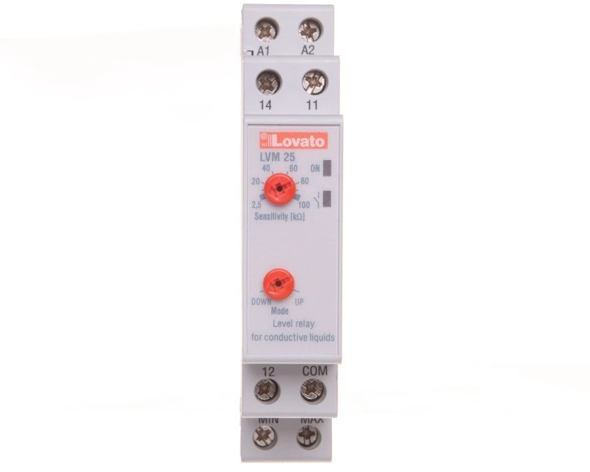 4. Przekaźnik kontroli poziomu cieczy, funkcje opróżniania lub napełniania, regulacja czułości, zasilanie 24...240VAC/DC LVM25240 350.80
