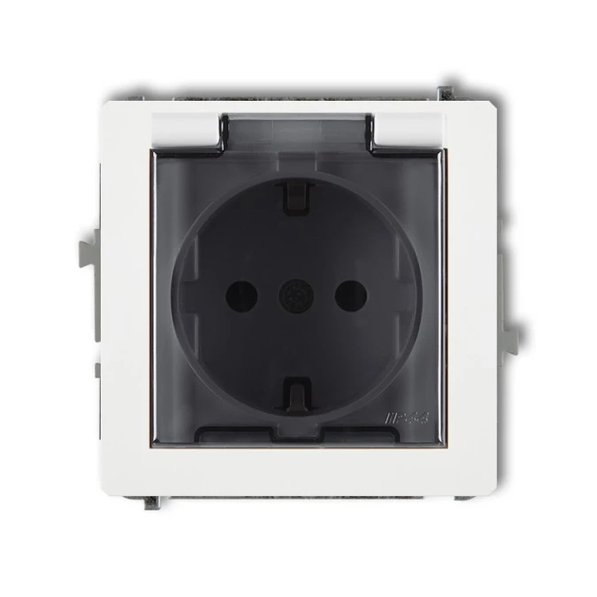 9. DECO Mechanizm gniazda bryzgoszczelnego z uziemieniem SCHUKO 2P+Z (klapka dymna, przesłony torów prądowych), biały mat 25DGPB-1s 56.19