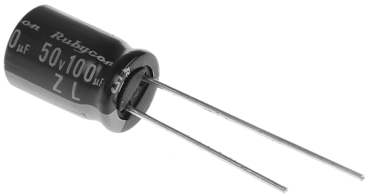 Kondensator 100μF 50V dc Radialny, Otwór przelotowy Rubycon roztaw: 3.5mm 8 (Dia.) x 11.5mm