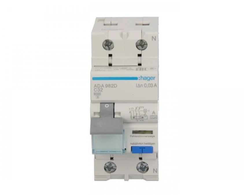 1. Wyłącznik różnicowoprądowy z członem nadprądowym C 32A 1P+N 10kA 30mA typ A ADA582D HAGER 424.71