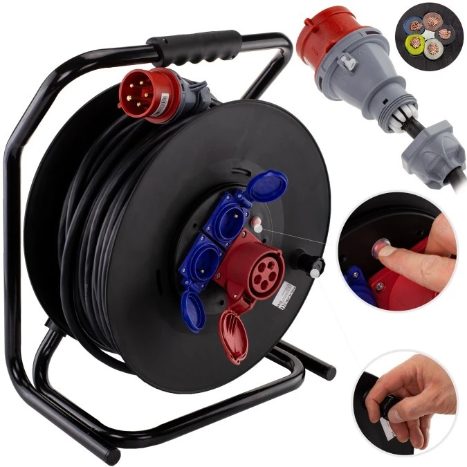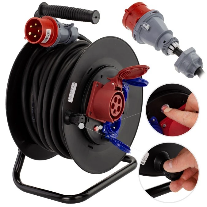 Przedłużacz siłowy zwijany na bębnie Rozgałęźnik budowlany na 1 gniazdo siłowe 5p 400V 16A + 2 gniazda 2P+Z 230V 16A IP44 na kab