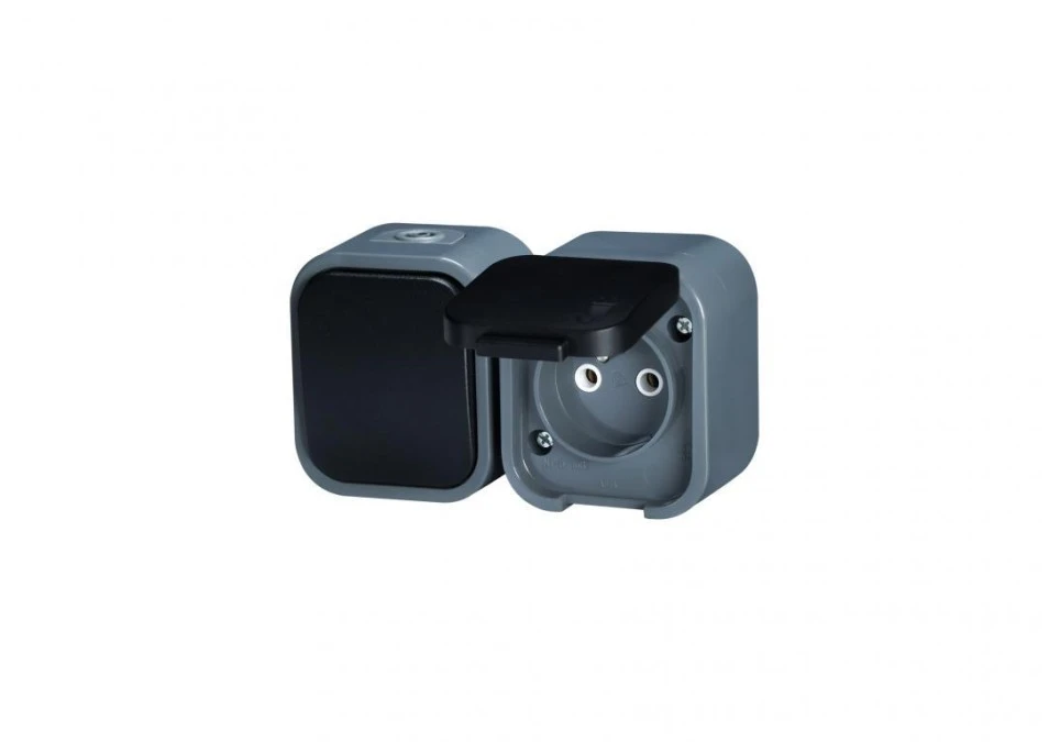8. B2 Gniazdo pojedyncze n/t 2p+Z, bryzgoodp. + Łącznik IP54 szary/czarny 00060278 18.68