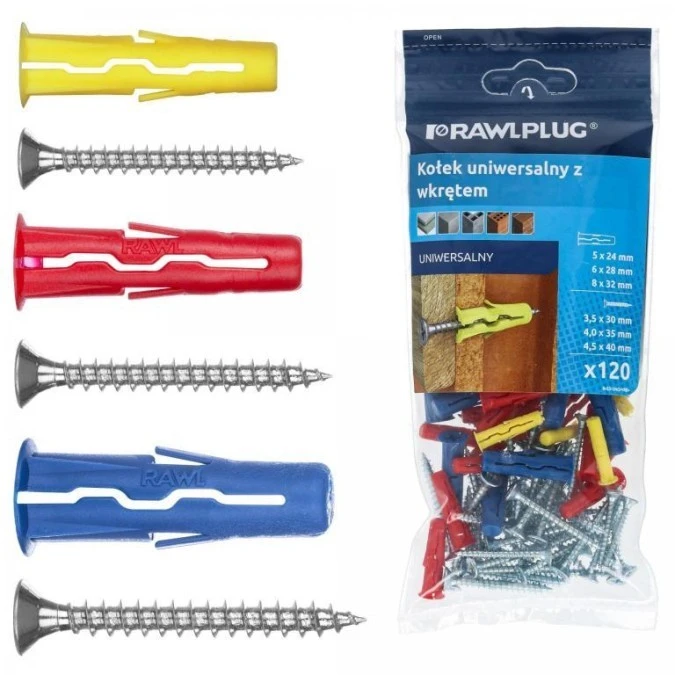 MIX Kołki rozporowe uniwersalne UNO 5x24, 6x28, 8x32 z wkrętem z łbem stożkowym 120 elementów RAWLPLUG