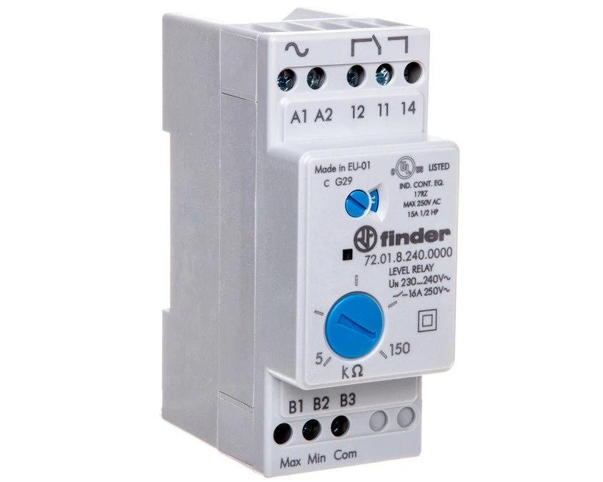 Przekaźnik kontroli poziomu cieczy (przewodzących) funkcja opróżniania/napełnienia, czułość nastawna 125V AC 72.01.8.125.0000