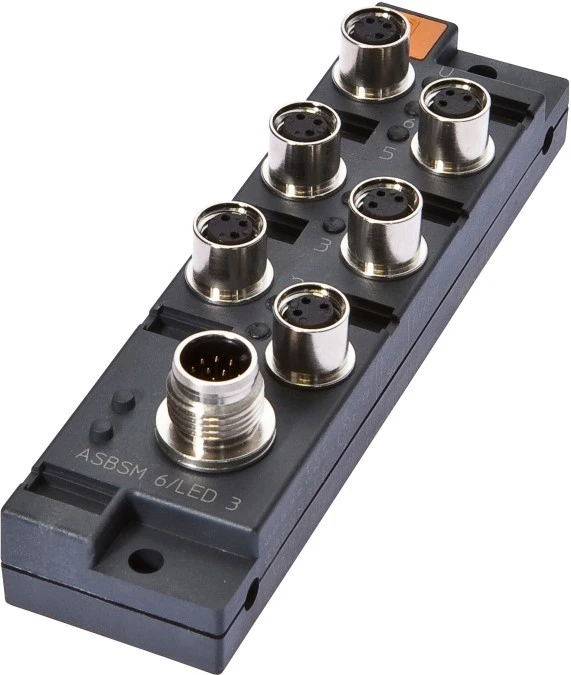 Rozdzielacz, 29x113x30mm, 10-30V DC, 6x M8 3pin, M12 12pin, IP67, PBT, z wyświetlaczem LED, 1,5A, VK001022