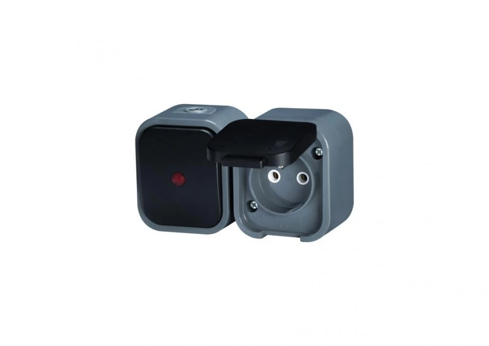 9. B2 Gniazdo pojedyncze n/t 2p+Z bryzgoodp. + Łącznik podświetlany IP54 szary/czarny 00060278 21.87