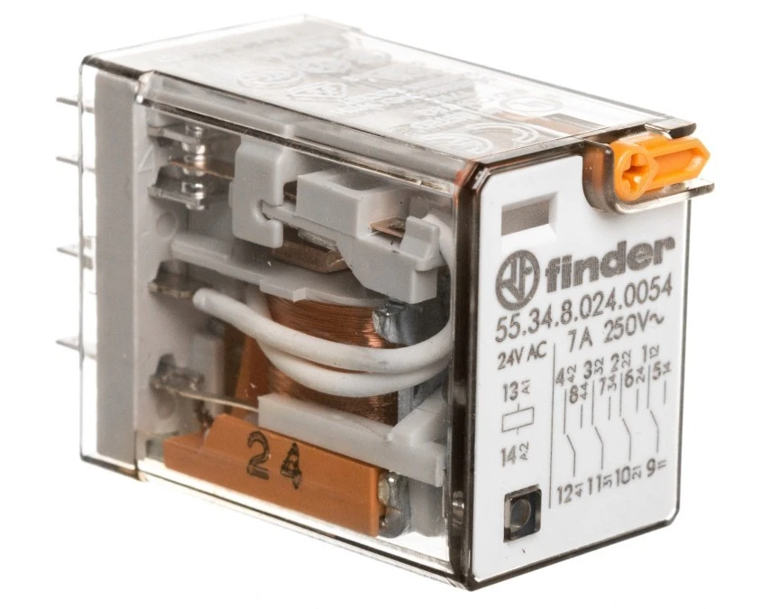 9. Przekaźnik przemysłowy 4P 7A 24V AC przycisk testujący mechaniczny wskaźnik zadziałania AgNi 55.34.8.024.0054 48.07