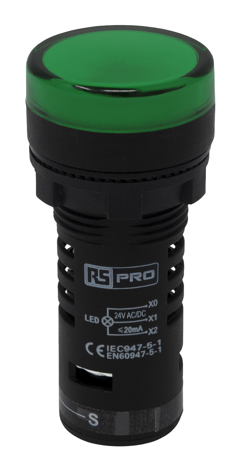 4. Kontrolka 24V ac/dc Zielony RS PRO średnica wycięcia 22mm Montaż panelowy Śruba 48.68