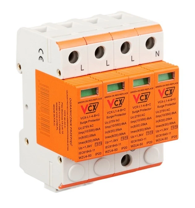 Ochronnik przepięć-ogranicznik modułowy 4P 7kA 275V TYP 1+2 Typ T1+T2 7kA ogranicznik przepięć 4P 3-F 20-50kA VCX