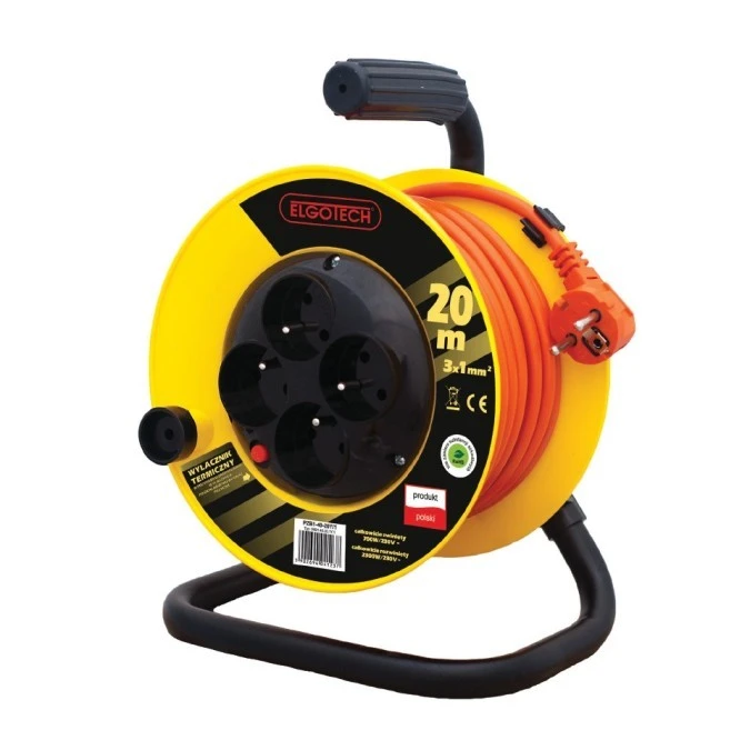 Przedłużacz bębnowy 20m 3x1 4x2P+PE PVC IP20 kabel zwijany na bębnie 4 gniazda z uziemieniem PZB-40-20Y/1 ELGOTECH