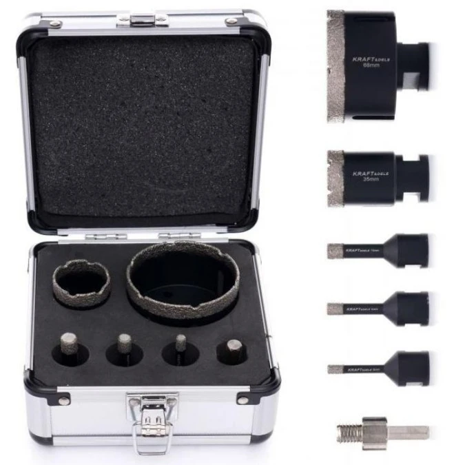 Zestaw otwornic Diamentowych 6-68mm do gresu, kamienia, płytek itp. Komplet 5szt. + adapter w walizce Kraft&Dele KD11226