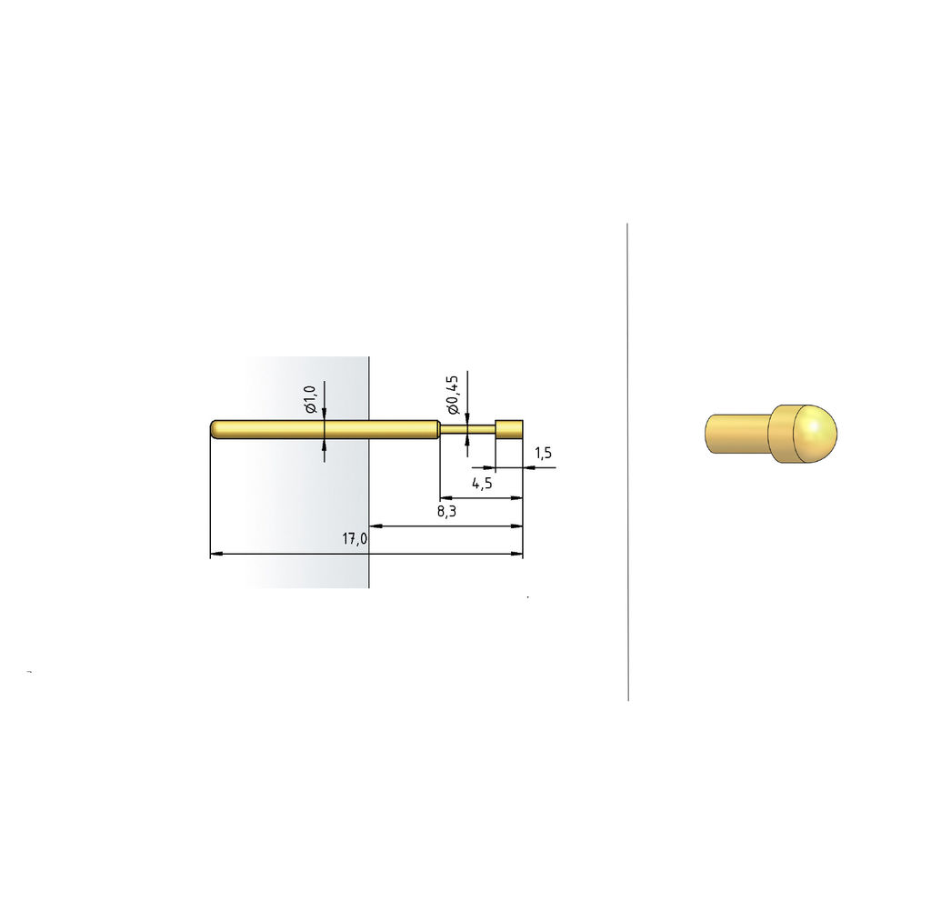 ICT spring contact with probe, round head, Ø 1.37 mm, travel  6.4 mm, pitch 2.54 mm, L 33.4 mm, 1025/E-H-2.25N-AU-1.5