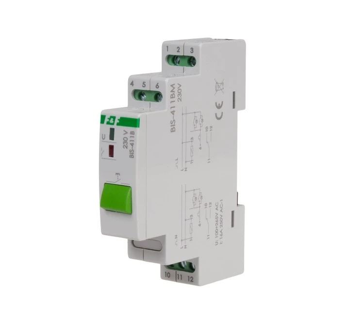 2. Przekaźnik bistabilny z przyciskiem do sterowania ręcznego i z pamięcią montaż na szynie DIN 230V BIS-411BM 108.58