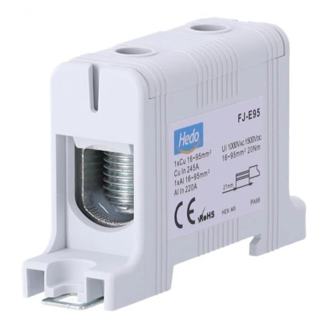 Blok rozdzielczy odgałęźny Al/Cu 16-95mm2 (max. 95mm2) na szynę TH35 szary FJ-E95 HEDO
