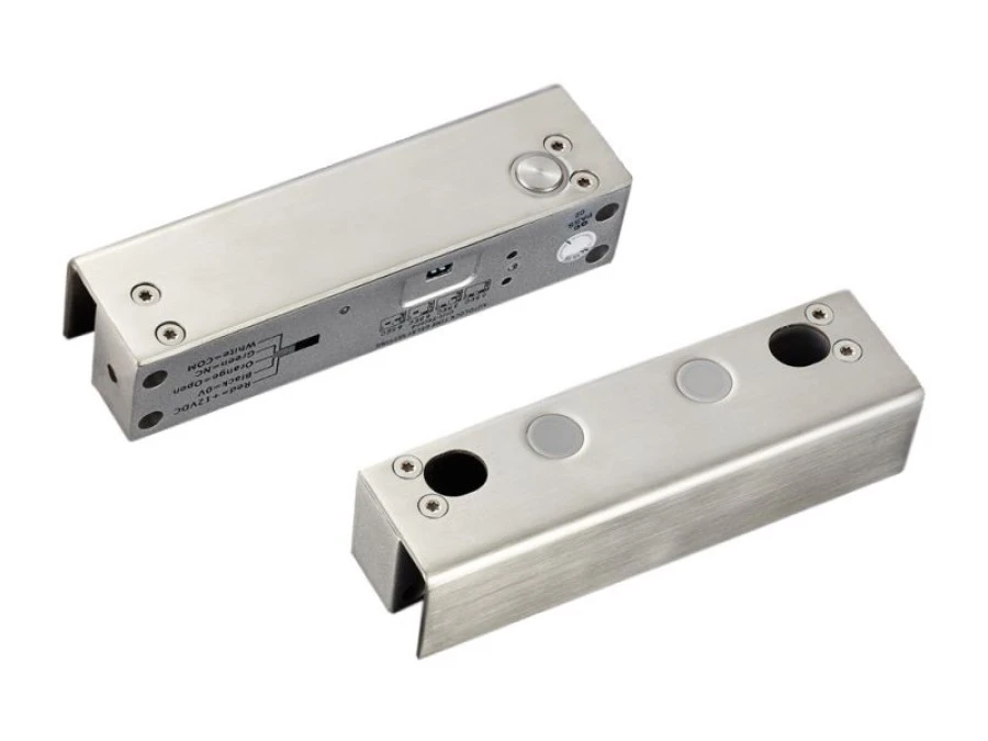 3. Elektrozamek trzpieniowy rewersyjny do witryn szklanych siła trzymania 1000 kg, sygnalizacja dioda LED, zwłoka czasowa, 12V DC 429.17