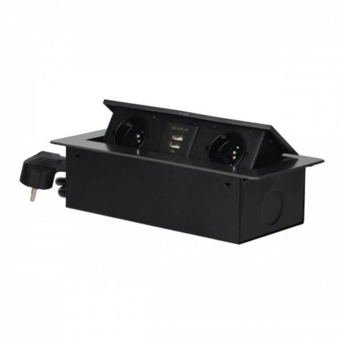 17. Gniazdo meblowe wpuszczane w blat z płaskim frezowanym rantem, ładowarką USB i przewodem 1,5m, 2x2P+Z, 2xUSB (typ A, 2,1A), graf 460.08