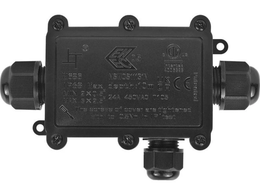1. Prostokątna puszka instalacyjna IP68 2 wloty + złącze 3 torowe 15.07