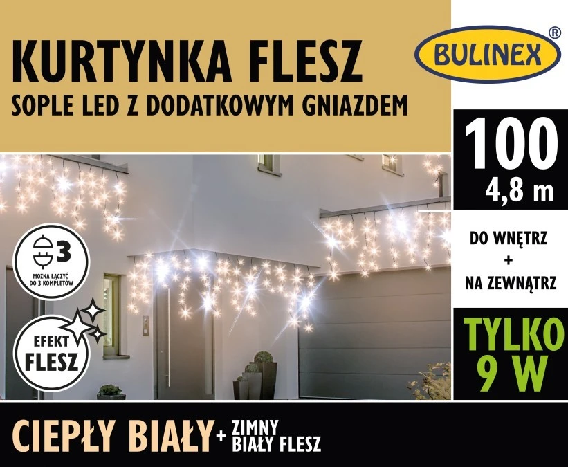 Kurtyna świetlna zewnętrzna FLESZ 100 LED SOPLE z gn. i zasilaczem biały/flesz 4,8m szer+5m, łącz max 3kpl 230V 9W IP44 13-564