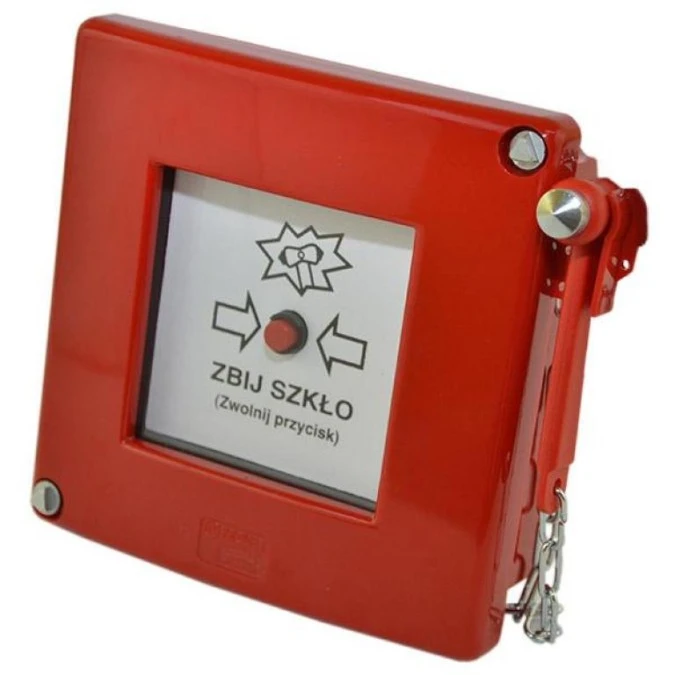 Przycisk bezpieczeństwa 2R czerwony w obudowie OBC pierścień niklowany z młoteczkiem SP22-B-02/OBC/BM