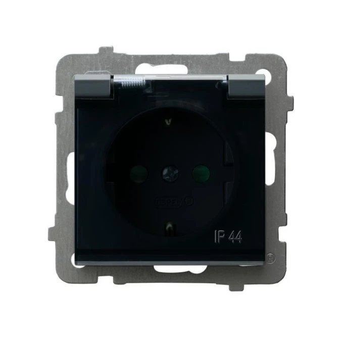 SONATA Gniazdo bryzgoszczelne z uziemieniem schuko IP-44 z przesłonami wieczko przezroczyste szary grafit GPH-1RSP/m/73/d