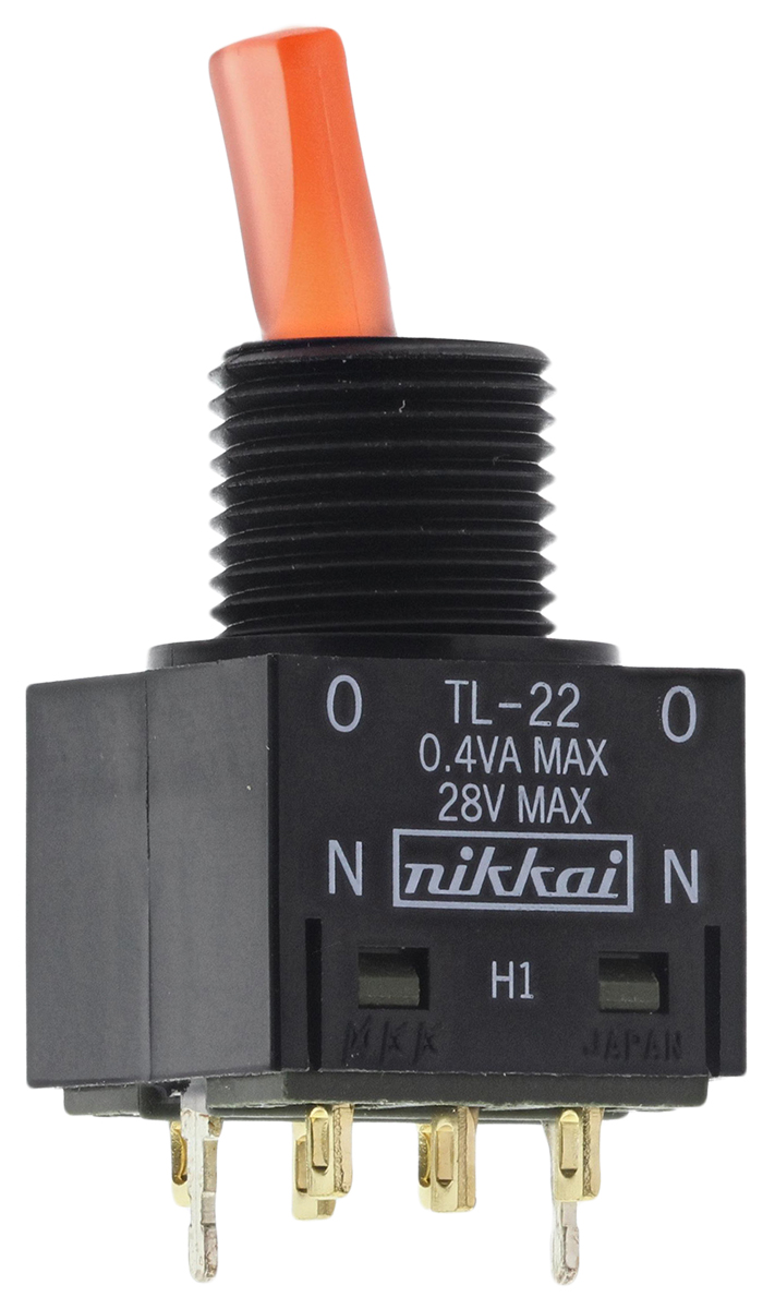 Przełącznik migowy przechylny Wł.-wł. średnica wycięcia 12.5mm DPDT NKK Switches Montaż panelowy długość przełącznika