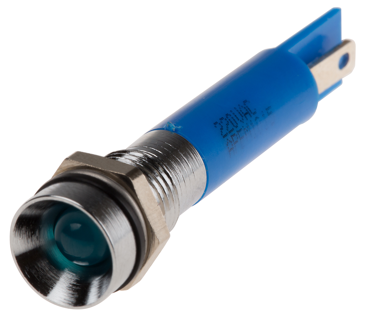 14. Lampka kontrolna do montażu panelowego 220V ac, niebieska 8mm LED Chrom Faston, oczko lutownicze RS PRO 83.17