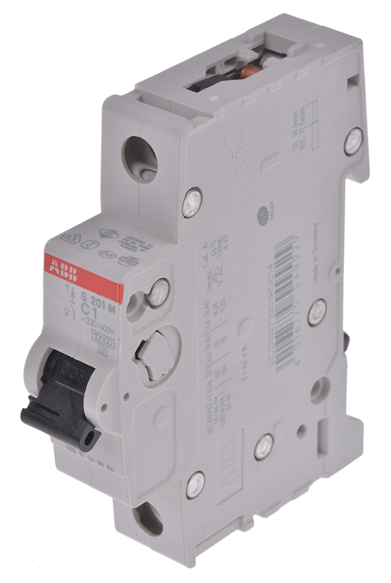 8. Wyłącznik nadprądowy MCB, Typ C, 1-biegunowy, 1A, 253V, 72V, na szynę DIN, ABB S201M-C2, S200M 137.69