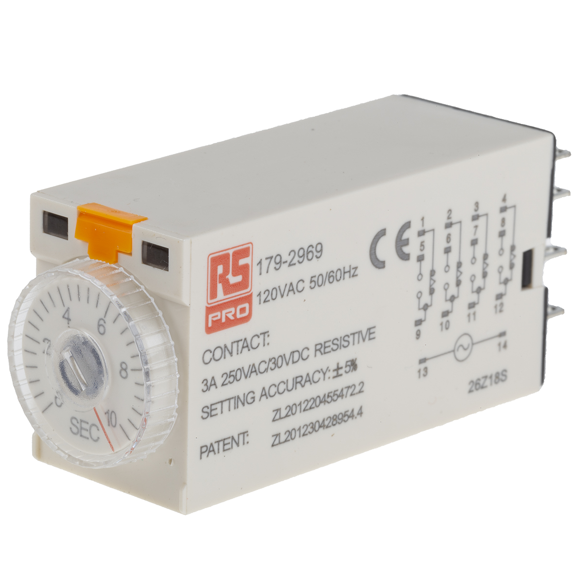 11. Timer Relay Wciskane 110V ac 4PDT 4-stykowy RS PRO 4PDT 0.1 → 3min jednofunkcyjny 235.34