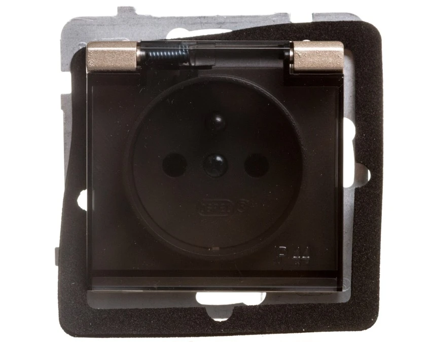 12. SONATA Gniazdo bryzgoszczelne z/u IP44 klapka przezroczysta czekoladowy metalik GPH-1RZ/m/40/d 33.22