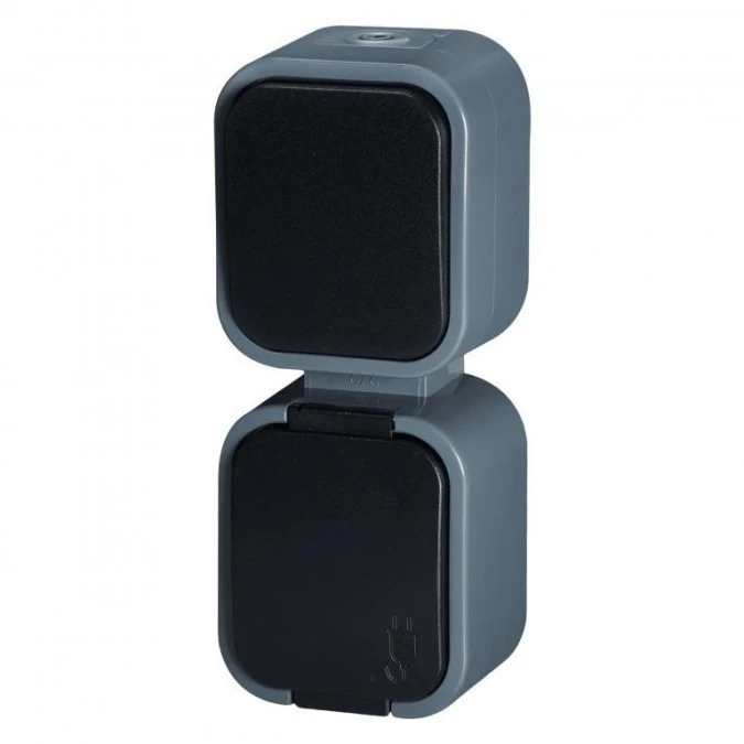 Gniazdo podwójne n/t 2x2P+Z, bryzgoszczelne z klapką, pionowe B2, IP54, NT-6B2/P, szary/czarny,OR-OE-7806/V/GB
