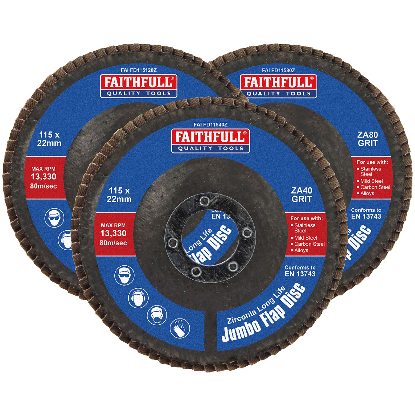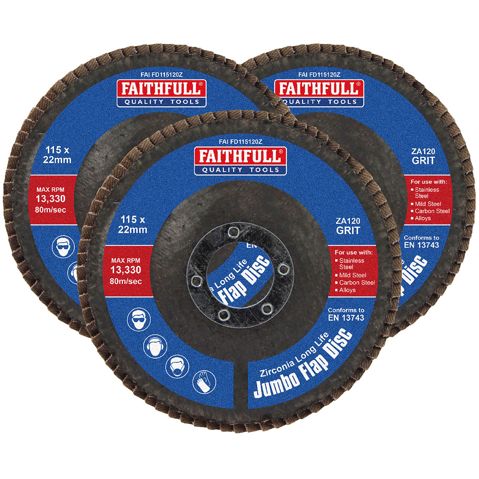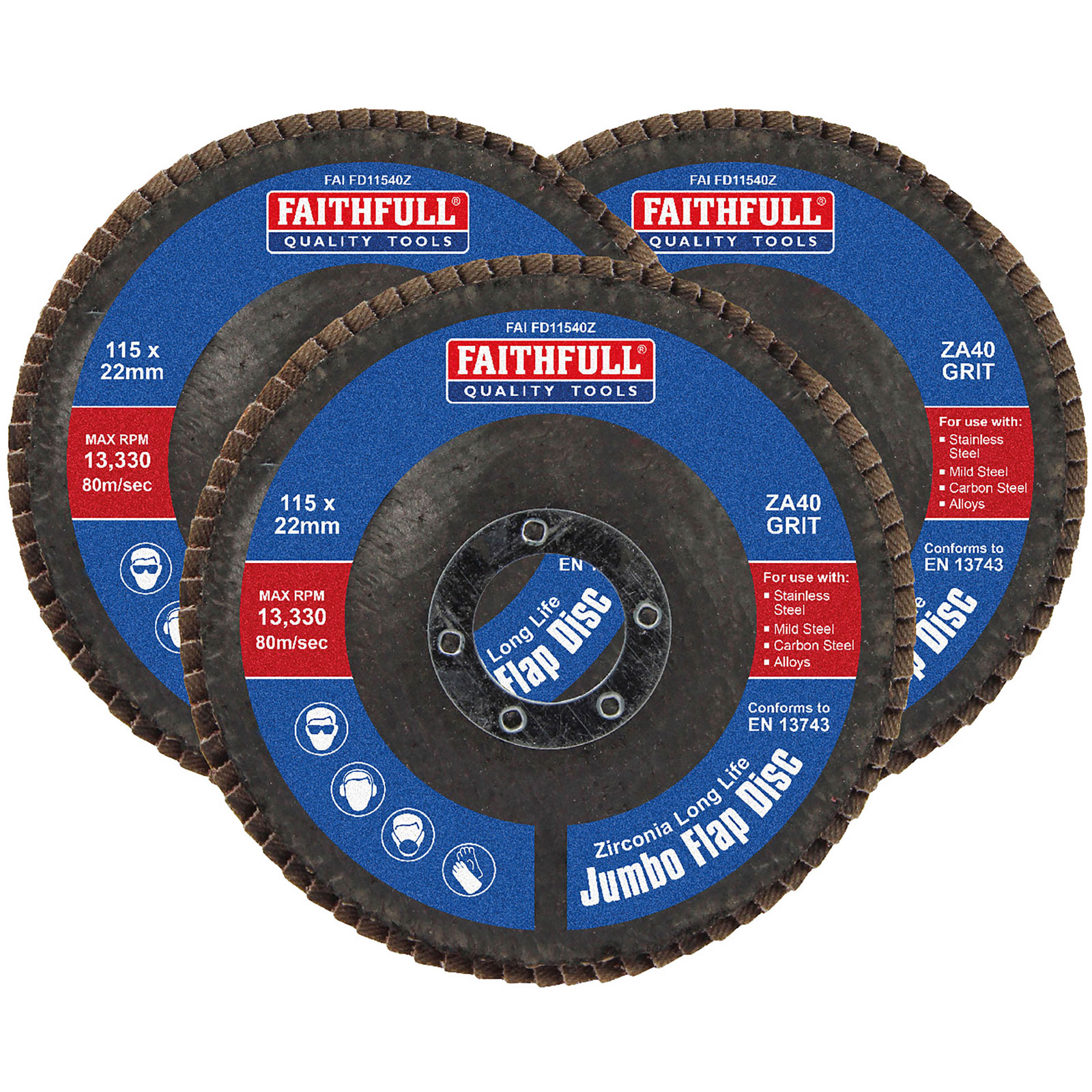 4. Faithfull FAIFD115ZM3 Zirconia Abrasive Jumbo Flap Disc 115x22mm Mixed Grit 3Pk 94.03