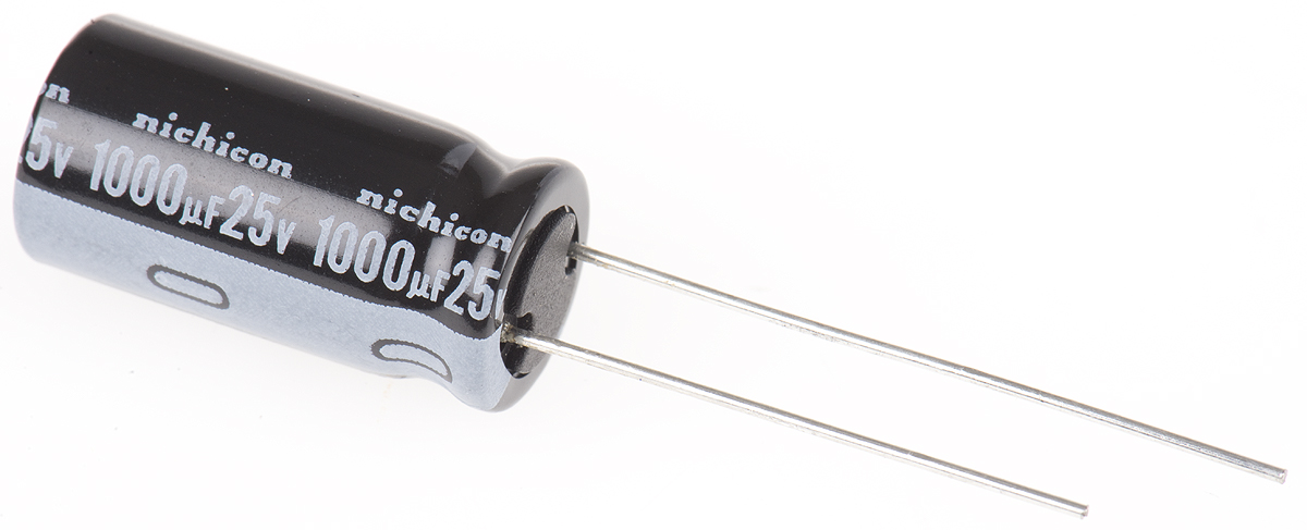 4. Kondensator 1000μF 25V dc Radialny, Otwór przelotowy Nichicon roztaw: 5mm 10 (Dia.) x 20mm 1.81 x25