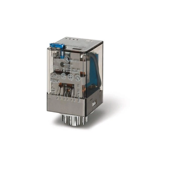 9. Przekaźnik miniaturowy 4P 7A 110V AC, styk AgNi+Au, przycisk testujący + LED 55.34.8.110.5050 88.67