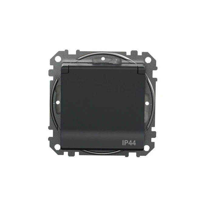 Gniazdo zas 2P+PE z przesł torów pr, zaciski bezgw IP44, czarny antracyt, Sedna Design i Elements SDD214014