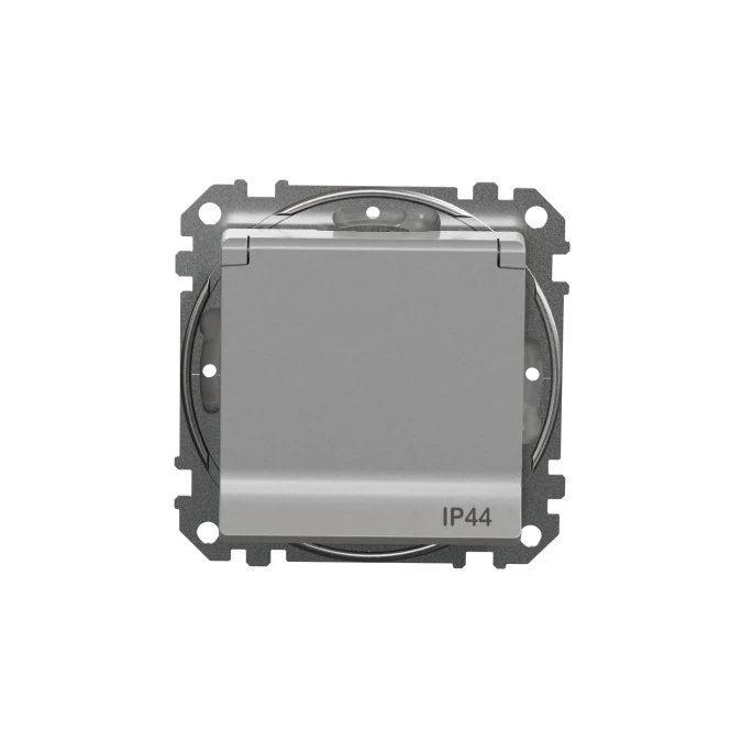6. Gniazdo zas 2P+PE z przesł torów prąd, zaciski bezgw IP44, srebrne alum., Sedna Design i Elements SDD213014 32.23