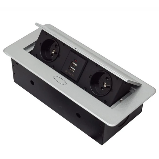Gniazdo blatowe 3-krotne +2xUSB z pokrywą uchylną srebrne GB2PL+2-SILVER