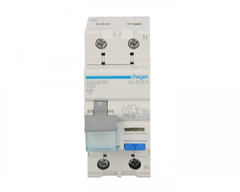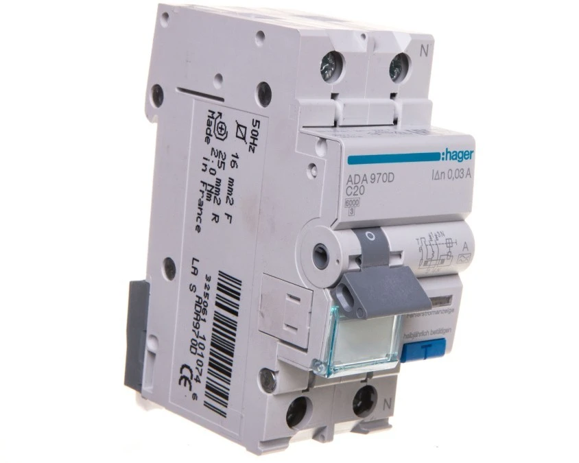 14. Wyłącznik różnicowoprądowy z członem nadprądowym C 20A 1P+N 10kA 30mA Typ A ADA570D HAGER 417.83