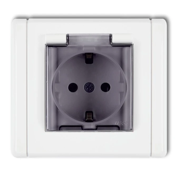2. JUNIOR IP54 Wyłącznik podwójny świecznikowy z gniazdem hermetycznym schuko (klapka dymna: przesłony torów prądowych) biały WGHP- 35.10