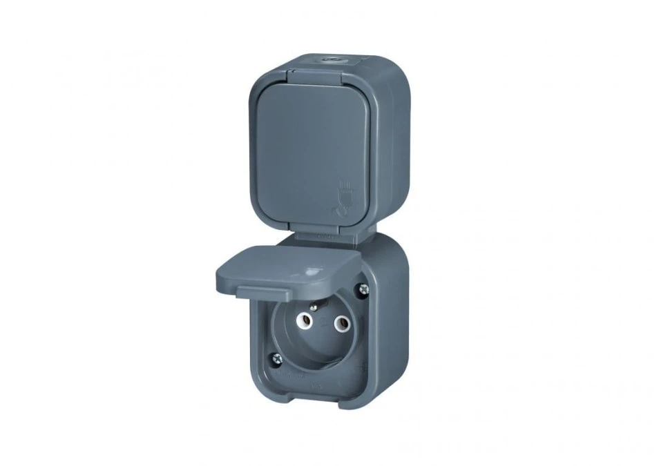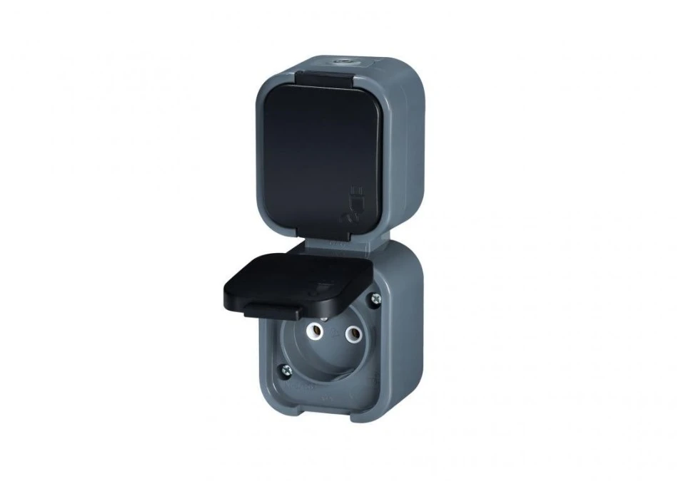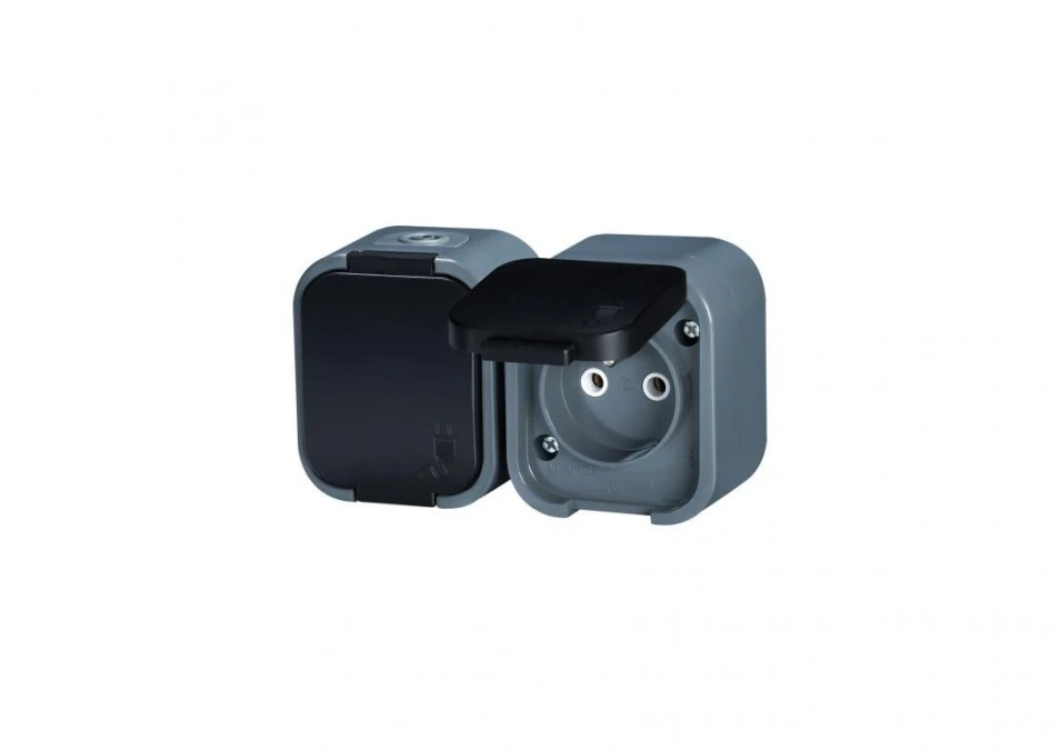 B2 Gniazdo podówjne 2P+Z bryzgoodporne z klapką w kolorze czarnym IP 54 pionowe szary 00060278