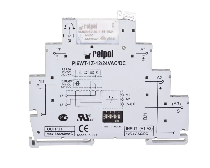 Przekaźnik czasowy wąskoprofilowy wielofunkcyjny 1Z 6A 1sek-10dni 24V AC/DC PIR6WT-1Z-24VAC/DC-R 857666