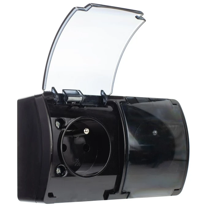 2. Gniazdo hermetyczne podwójne 2x 2P+Z natynkowe IP44 czarne / przezroczyste Koala 162-55 26.27