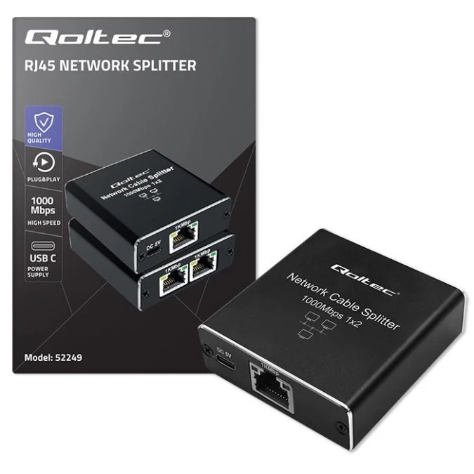 10. Qoltec Rozdzielacz Splitter mini SWITCH 1x2 port RJ45 1000Mbps USB-C Aluminium 40.04