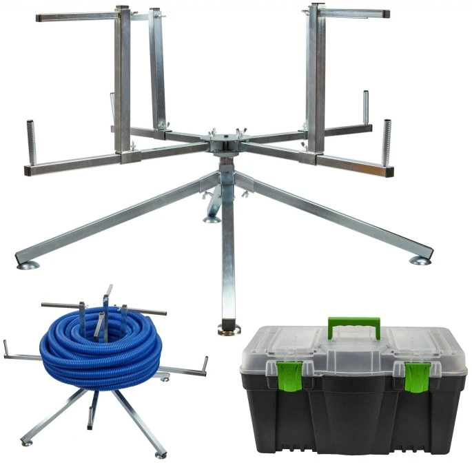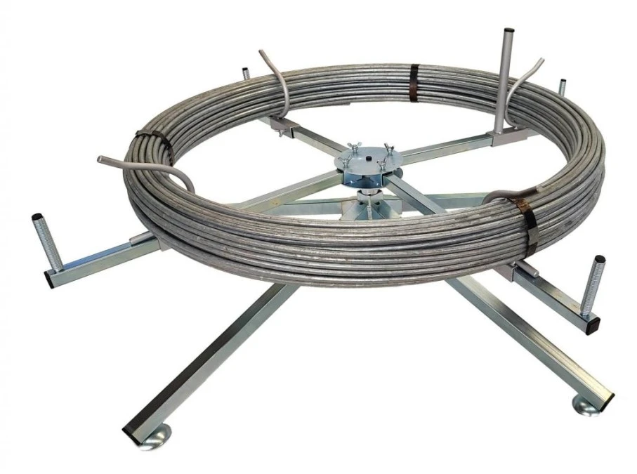 Rozwijak składany stalowy ocynkowany do rur ogrzewania podłogowego PERT PEX (600m) i peszli karbowanych w zestawie z prowadnicą