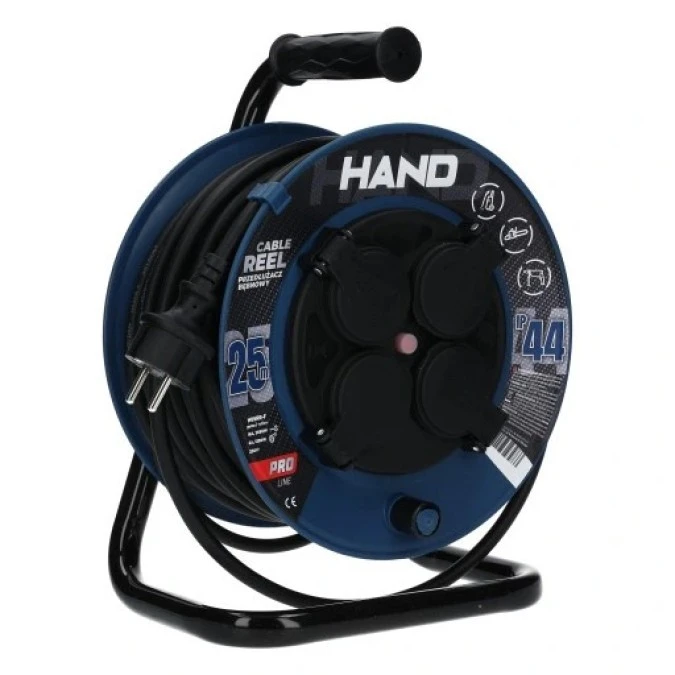 Przedłużacz budowlany zwijany na bębnie Rozgałęźnik na 4 gniazda 2P+Z 230V IP44 na kablu OW 3x2,5mm2 25m HAND