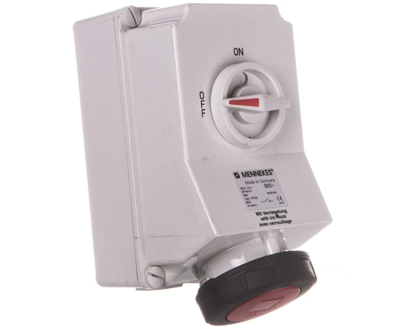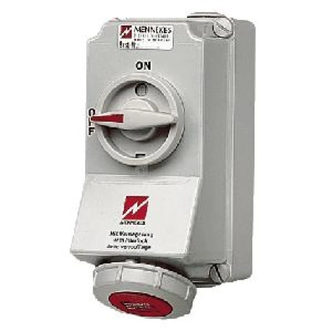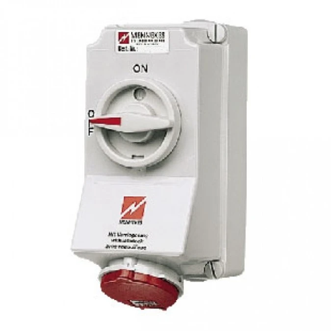 Gniazdo naścienne z rozłącznikiem 63A 5p 6h 400V IP67 z podwójną blokadą mechaniczną MEN5113A