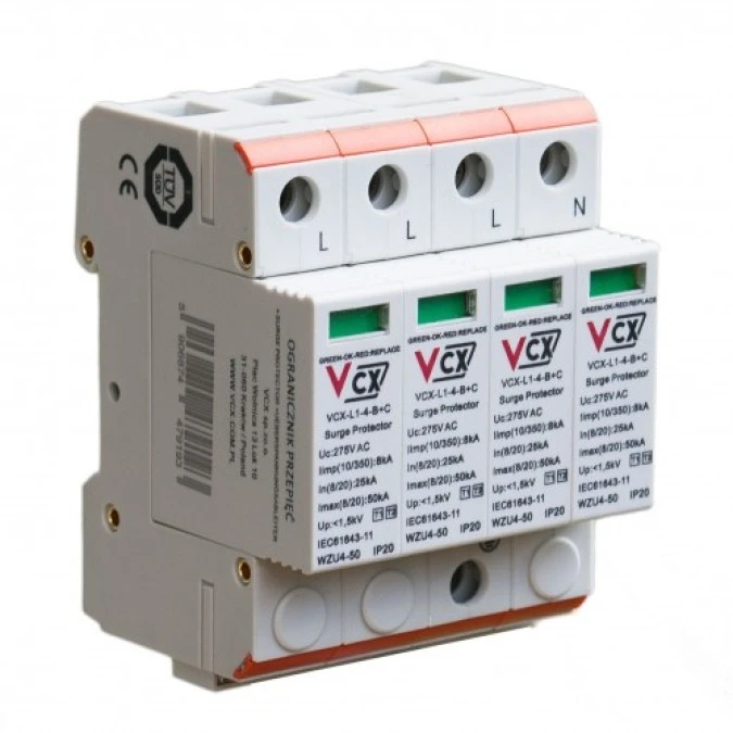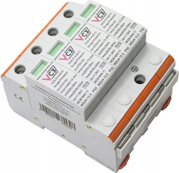 8. Ochronnik przepięć ogranicznik modułowy Typ T1+T2 4P 3-F 12,5kA z iskiernikiem VCX 296.17